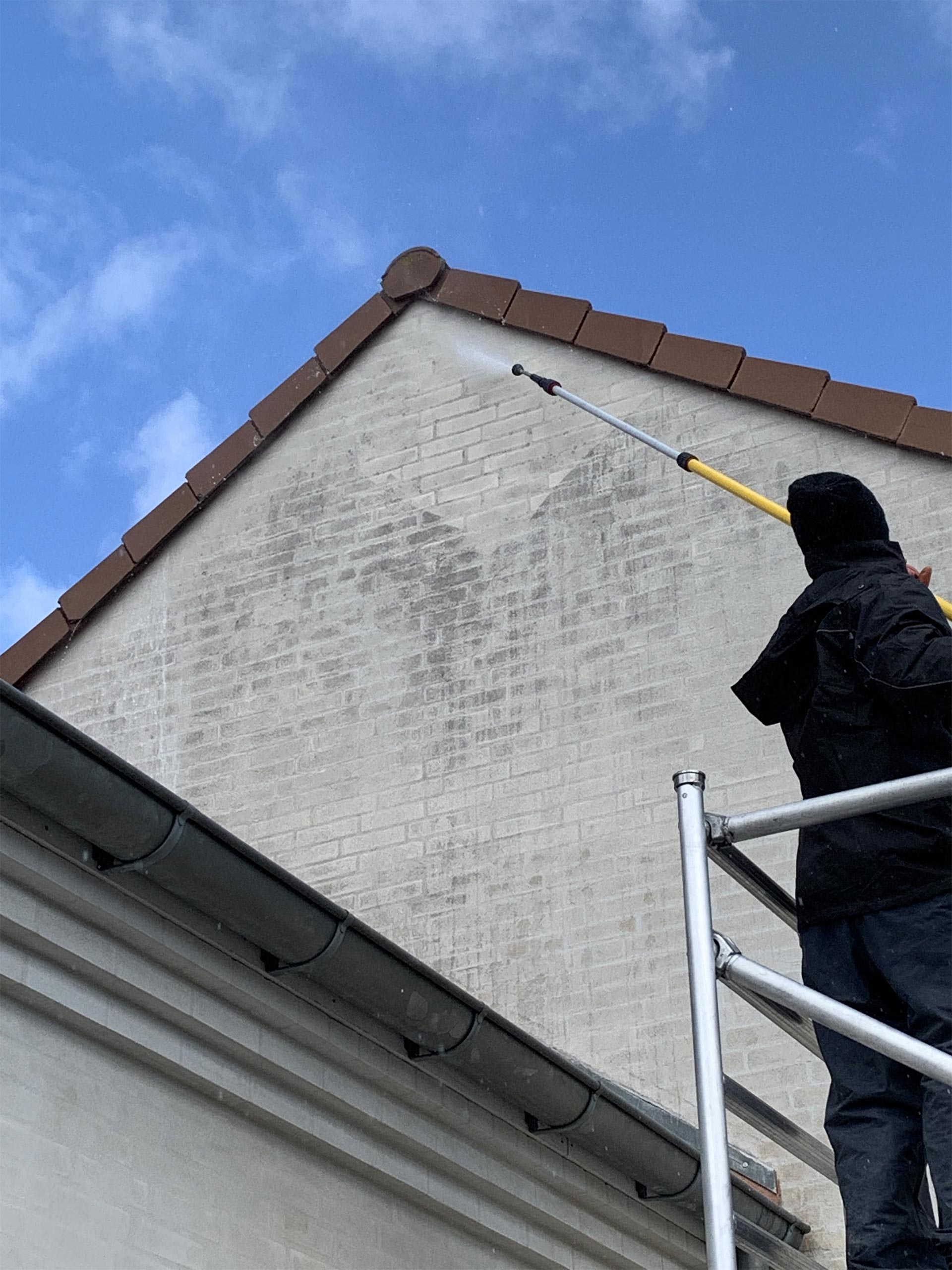 Efter afrensning af facaden påfører vi Neutralon, som er godkendt af Miljøstyrelsen som algebekæmpelsesmiddel i Danmark. Overfladen har nemlig brug for en form for beskyttelse/imprægnering for at beskytte facaden i fremtiden, og hos H2O Graffitirens har vi stor erfaring med imprægnering. Vores imprægnering gør, at overfladen bliver vandafvisende, og da facaden bliver vandafvisende, får alger og snavs et svært job med at ødelægge facaden.